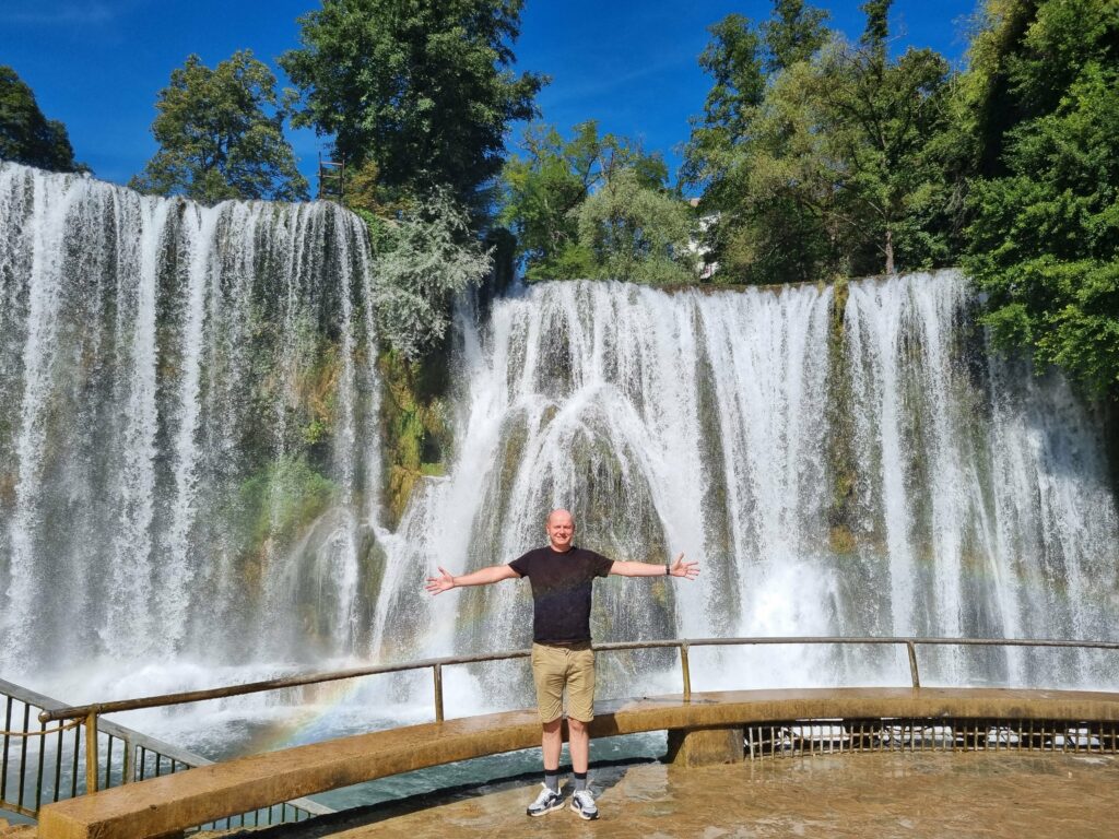 Zaledwie 20 minut jazdy od Medziugoria (i blisko granicy z Chorwacją) trafiliśmy do naturalnego amfiteatru. Wodospady Kravica często nazywane są „małą Niagarą” i choć skala jest inna, wrażenie – piorunujące. Woda spada tu szerokim łukiem z wysokości 25 metrów, tworząc szmaragdowe jezioro.