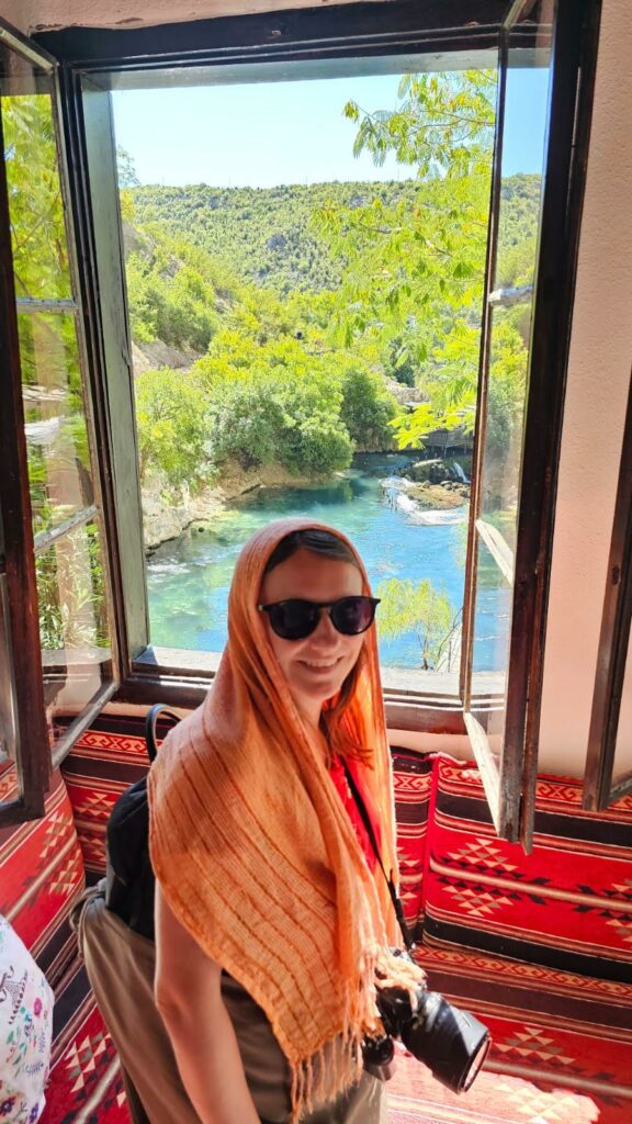 Widok jest surrealistyczny: gigantyczna, pionowa ściana skalna, z której wnętrza wypływa lodowata, granatowa rzeka, a tuż obok stoi biały, delikatny dom z drewnianymi krużgankami. Zwiedzanie wnętrza tekke (pamiętajcie o chustach i zakrytych ramionach – są dostępne przy wejściu) to podróż do świata islamskiego mistycyzmu. Skrzypiące podłogi, perskie dywany i widok z okna wprost na pędzącą wodę tworzą atmosferę absolutnego spokoju. Po zwiedzaniu usiedliśmy w jednej z restauracji nad samą wodą. Kawa po bośniacku w takim otoczeniu smakuje wybornie, choć szum wody jest tak głośny, że trudno rozmawiać. To był idealny moment na złapanie oddechu przed Mostarem.